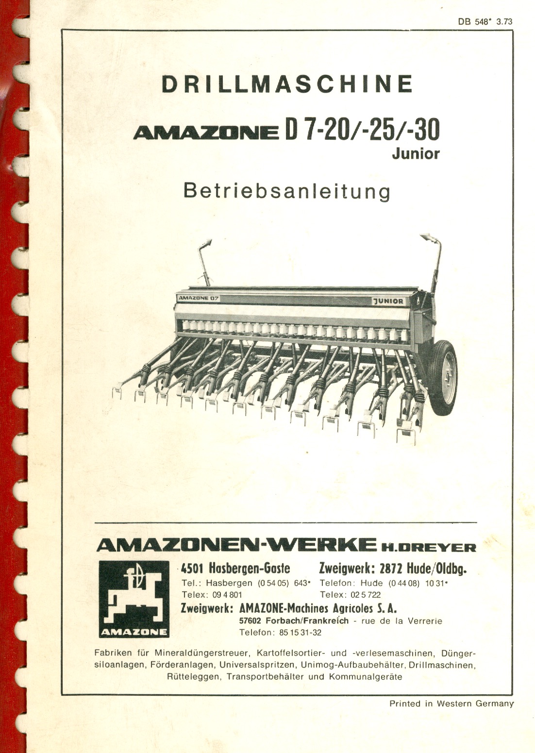 Amazone Drillmaschine D 7-20/-25/-30 Junior Betriebsanleitung