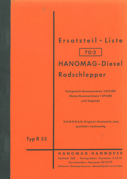 Ersatzteilliste 70/2 für Hanomag R 35 ab Fgst-Nummernkreis 2 275 001, Motor-Nummernkreis 1 275 001 folgende. 276 Seiten, Reprint.