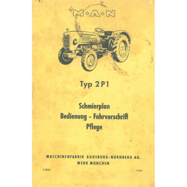 Bedienungsanleitung und Schmierplan MAN 2 P1, Stand: 11/60. 13 Seiten + Schmierplan aufklappbar, Format: A5 hoch, Sprache: deutsch, Zustand: deutliche Gebrauchsspuren.